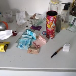 Os policiais verificaram a encomenda e constataram 2 tabletes de maconha, com cerca de 2 quilos bem vedados. Ao ser entrevistado, o suspeito confirmou que encomendou a droga do estado do Mato Grosso do Sul, via Facebook, para fins de tráfico. Também foi localizado, no guarda-roupas de sua casa, na parte superior, R$ 460,00 em espécie oriundos do tráfico, e uma balança de precisão.