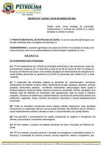 A Prefeitura de Petrolina de Goiás, editou Decreto nesta sexta-feira (5), suspendendo por dez dias, contados deste sábado (6), todas as atividades econômicas e não econômicas, para combater a disseminação da Covid-1