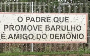 Em uma das placas, instalada em uma grade, está a frase: “O padre que promove barulho é amigo do demônio”. Em outra, é possível ler: “Quem reza irá para o céu, quem não reza irá para o inferno”, seguido de “Quem não reza é pior que o demônio”. Em outra área, está escrito: “quem promove o barulho serve ao demônio”.