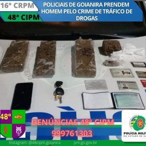 Já em Goianira, região metropolitana da capital, equipes da 48ª Companhia Independente de Polícia Militar (CIPM) apreenderam três peças de maconha, além de diversas porções do ilícito. Os militares realizavam rondas no município, quando abordaram o indivíduo suspeito, conduzindo um veículo. Além das drogas encontradas dentro do carro, o homem apresentou aos policiais um documento de identificação falso. Ele foi encaminhado à Delegacia de Polícia Civil da região, autuado por tráfico e falsidade ideológica.