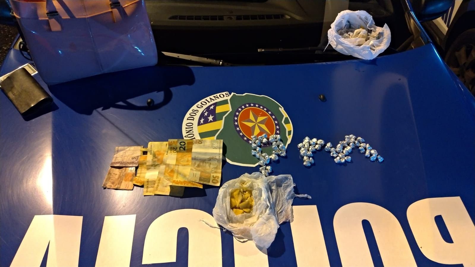 A Polícia Militar (PM) em patrulhamento em Jaraguá no Vale do São Patrício nesta sexta-feira (22), onde visualizaram um indivíduo em atitude suspeita conduzindo uma motocicleta. Assim, os militares realizaram a abordagem e, após a busca pessoal, foi realizada uma revista na bolsa que o condutor portava, onde foi encontrado as substâncias ilícitas, sendo 68 porções de crack, prontas para o comércio e 33 gramas de crack em pedaço apreendida.