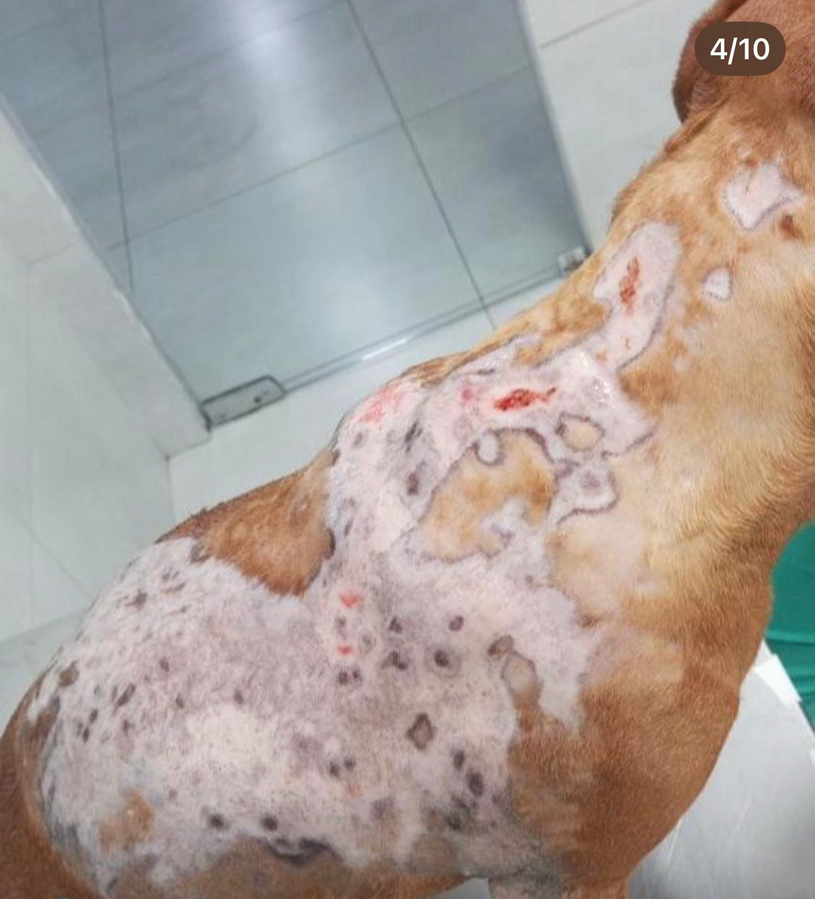 Devido à extensão dos ferimentos, o cão apresentou quadro de infecção secundária e complicações sistêmicas graves, chegando a necessitar de suporte de oxigênio durante a internação, ainda correndo risco de morte.