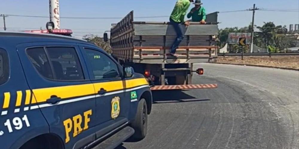Dois homens foram flagrados pela Policia Rodoviária Federal (PRF), sendo transportados na carroceria de um caminhão na manhã desta sexta-feira (4), na BR 153. A Polícia Rodoviária Federal (PRF) parou o veículo no perímetro urbano da Região Metropolitana de Goiânia.