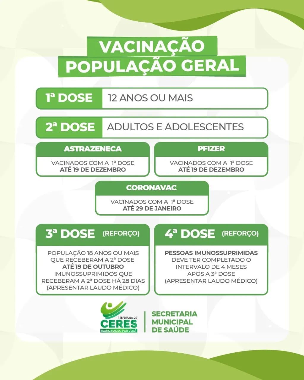 No próximo sábado (19) vai acontecer o Dia V de vacinação contra a Covid-19 em Ceres no Vale do São Patrício. Na ocasião, crianças e a população geral podem se vacinar.