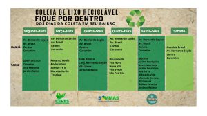 A Prefeitura de Ceres, por meio da Secretaria Municipal de Meio Ambiente e Saneamento (SEMMAS), informa os dias e horários da coleta de lixo reciclável nos bairros da cidade.